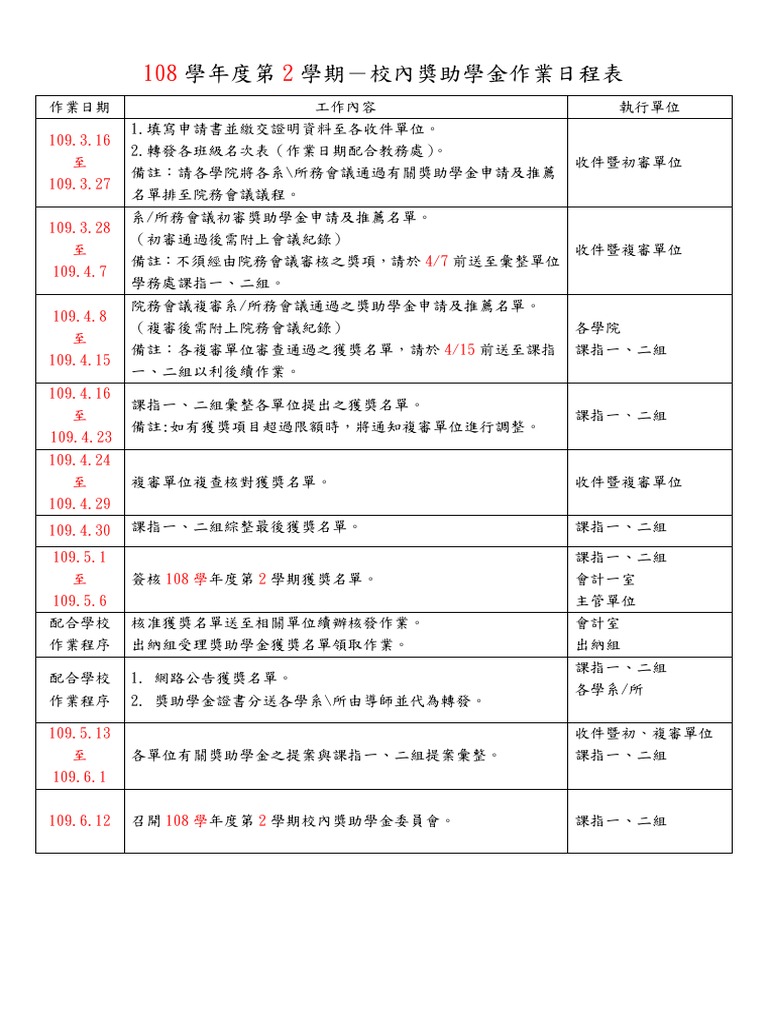 實踐大學校內獎助學金 校內獎助學金作業日程表 109 2獎學金日程表